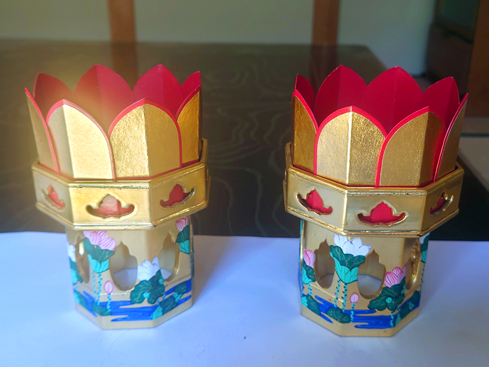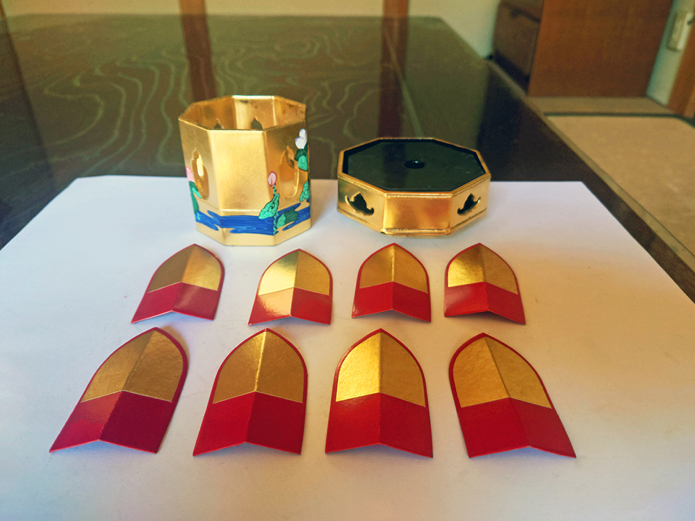 ご覧のように、八角形型の二つの部品と八枚の紙でできた花びらがあります。この花びらを方立(ほおたて)と呼びます。本体側は木製で金箔が押してあり、蓮水画が描かれております。