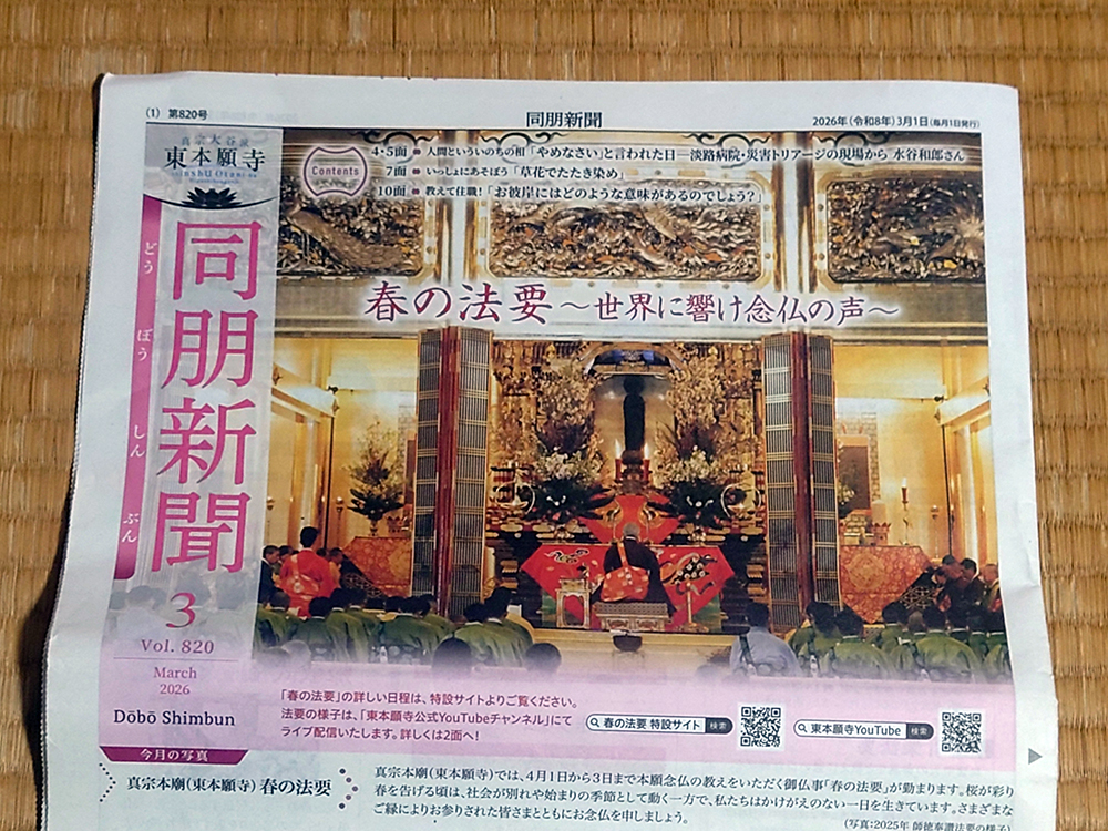 知らない人たちが多くなってきたと思いますが、京都のご本山では全国各地から寺院を集めての法要を年二回行っています。そのあたりにつきましては、去年も説明をしましたが、やはり、あらため話を進めます、もともと、四月の法要というジャンルを作ったのは、なぜなのか?を、どうしても皆様方に伝えたかったからです。京都のご本山から毎月発行している「同朋新聞」がございます。今回も、三月号の表紙は、この「春の法要」でした。この文章を書くたびに、「ああ、しまったなあ、もう一つ早く紹介をすればよかった」と思うのですが、