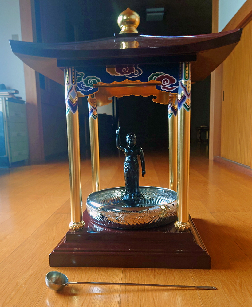 本願寺系のお寺は一昔前まではお盆と同様に、あまり力をいれてなかったのですが、やはり、仏教はお釈迦様の教えが源流ということですので、原点に返り、お釈迦様の誕生会をされる寺も、当寺を含め、以前より多くなりました。毎年、紹介をさせていただいておりますが、当寺は令和四年の第四日曜日に『親鸞聖人七百五十回御遠忌法要』を勤修させていただいたことを記念として、毎年、四月の第四土曜日曜両日に、新たな法要をさせていただくことにしました。土曜日の『こども報恩講』と日曜日の『納骨法要』です。やはり時代の流れでしょうか、一昔前までは、「お骨をお寺に納めた人たち」だけを対象にするなんて、けしからん、という風潮でしたが、今では普通の行事の一つになりました。「こども報恩講」も今のご時世ですので、なかなか……親鸞様とお釈迦さまの映画を見てもらうイベントを用意してますが、この写真は、その法要に使われるお釈迦様です。